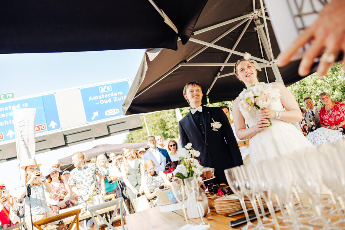 Zojuist is het eerste stel getrouwd op de snelweg. Wesley en Regina werden getrouwd door burgemeester Femke Halsema. Met een trouwring en het jawoord bezegelden zij hun huwelijk óp de Ring. Als aandenken aan deze symbolische plek krijgt ieder stel vandaag het hectometerpaaltje van de trouwlocatie mee van Rijkswaterstaat, die eigenaar van de Ring A10.