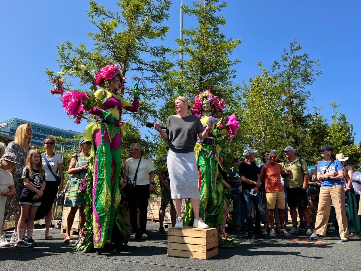 Zojuist werd het Bos op de Ring geopend door wethouder Melanie van der Horst. Dit deed zij samen met Stella van Opdorp, die vandaag 6 jaar is geworden. Samen gaven zij met een grote gieter het verjaardagsbos water en namen zij één van de 750 gedoneerde nestkastjes in ontvangst.