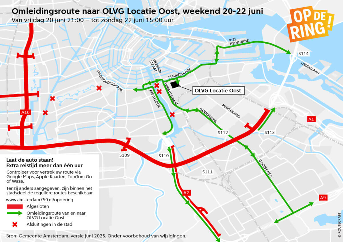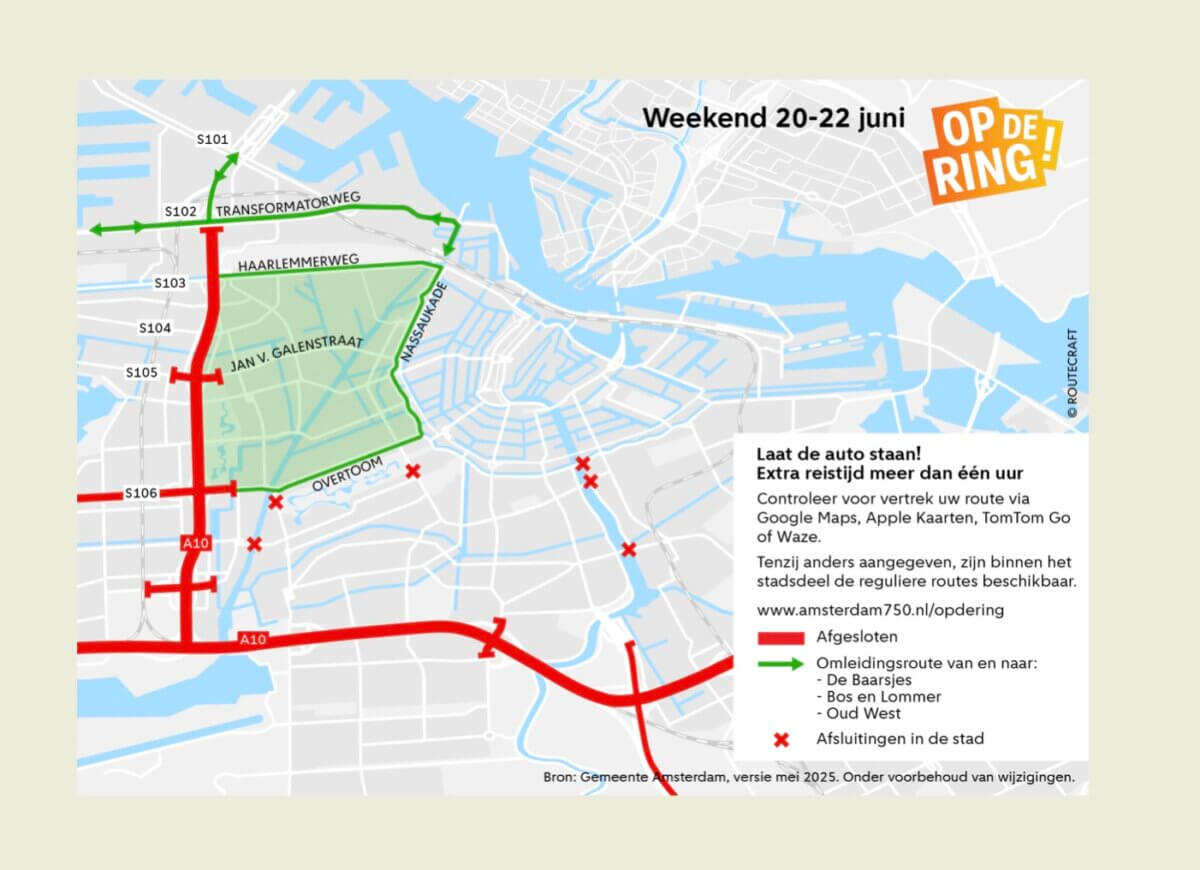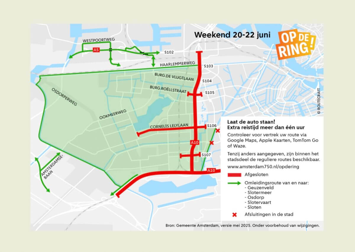 Due to the Op de Ring festival, a large section of the A10 Ring Road will be closed over the weekend of 20–22 June. Significant traffic congestion is expected. Visitors to the city or the festival are advised to come on foot, by bike, or by public transport if necessary. Leave your car at home!